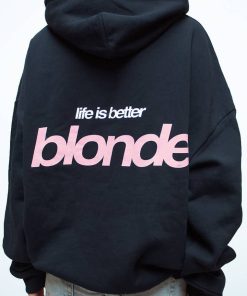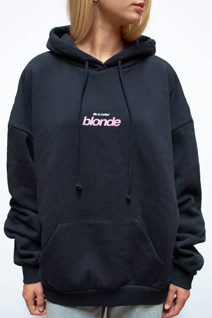 Hoodie with Blonde print, front pockets, long sleeves, long length, relaxed fit