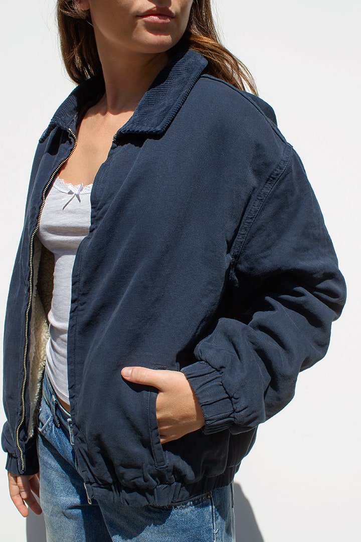 Bomber Jacket, with collar, faux fur inner padding, zip fastening, with side pockets, long sleeves, stretchy cuffs and hem, regular length, relaxed fit.