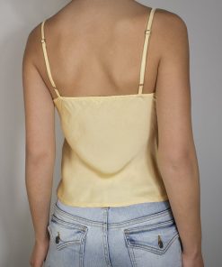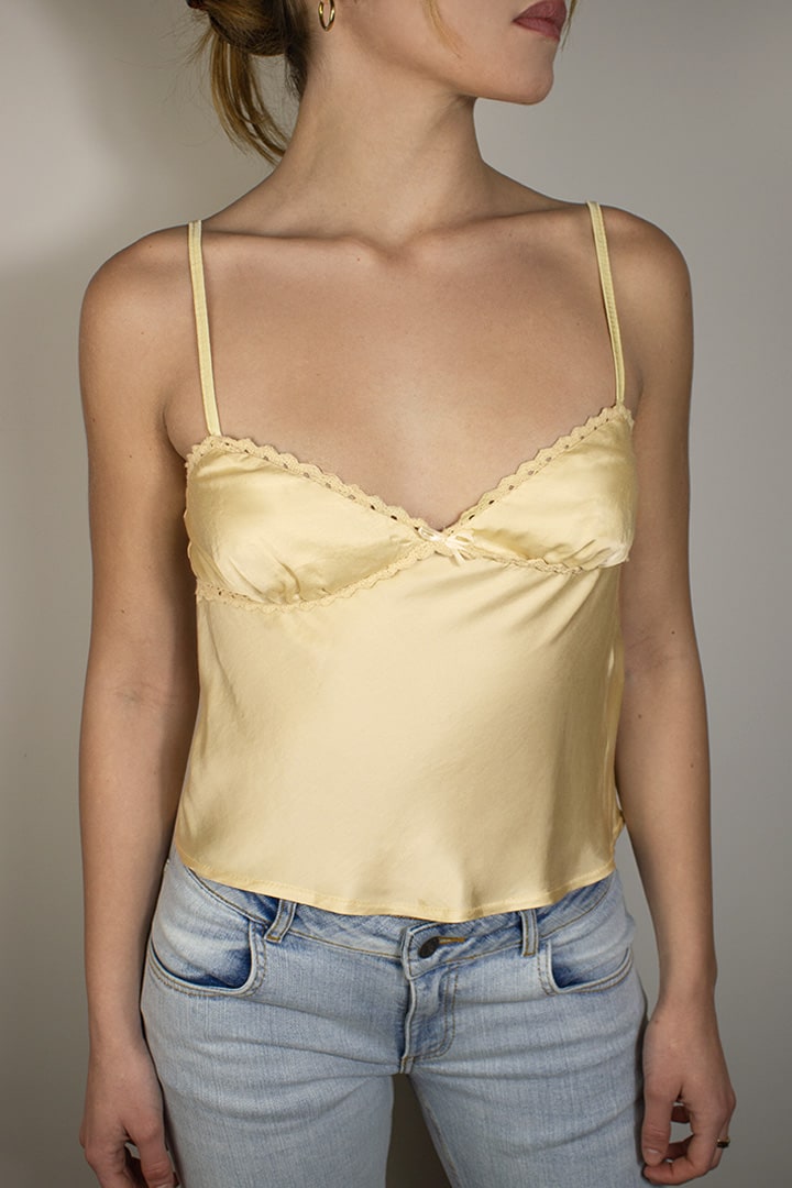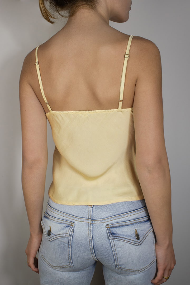 Bow tank top, sleeveless, thin straps, regular length, slim fit.
