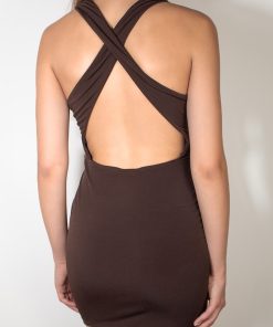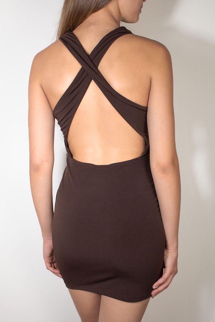 Cross back dress, boat neckline, sleeveless, short length, slim fit.
