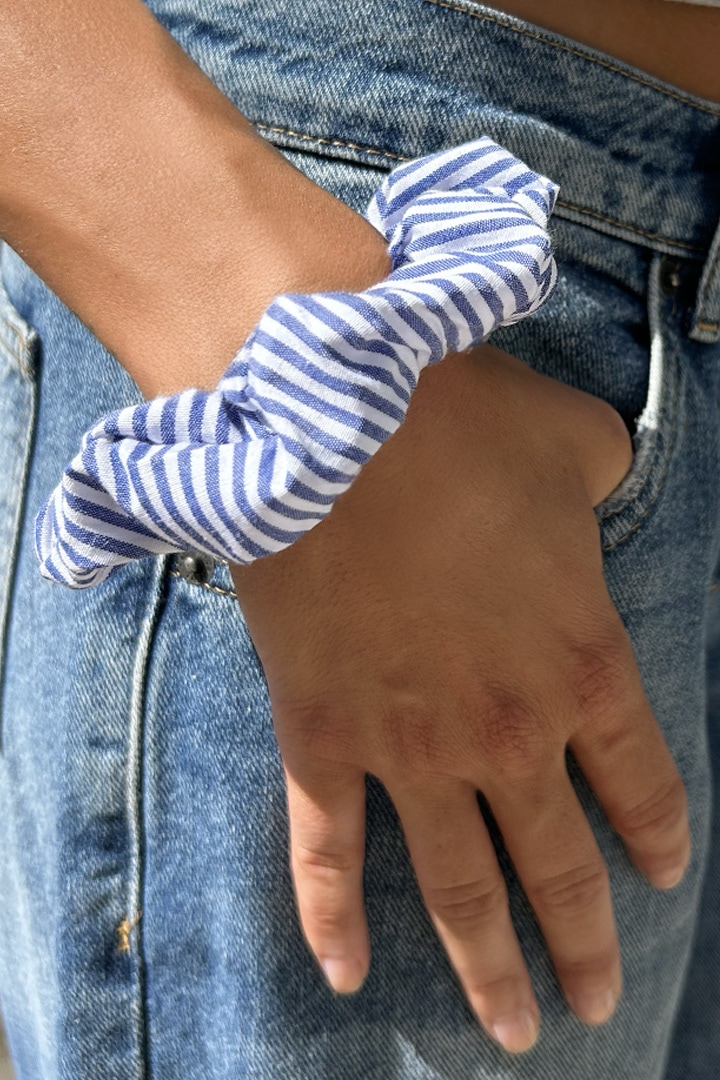 Hair scrunchie, stiped pattern, stretchy fabric.