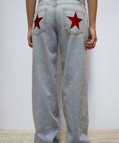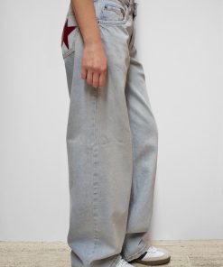 Wide leg jeans, low waist, with stars on back pockets, button up and zip fastening, 4 pockets, belt loops, relaxed fit. Because we individually distress each item you will notice areas of fading and wear. These nuances are intentional and add to the character and finish of our garment.