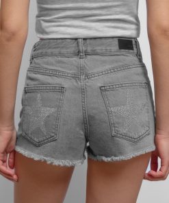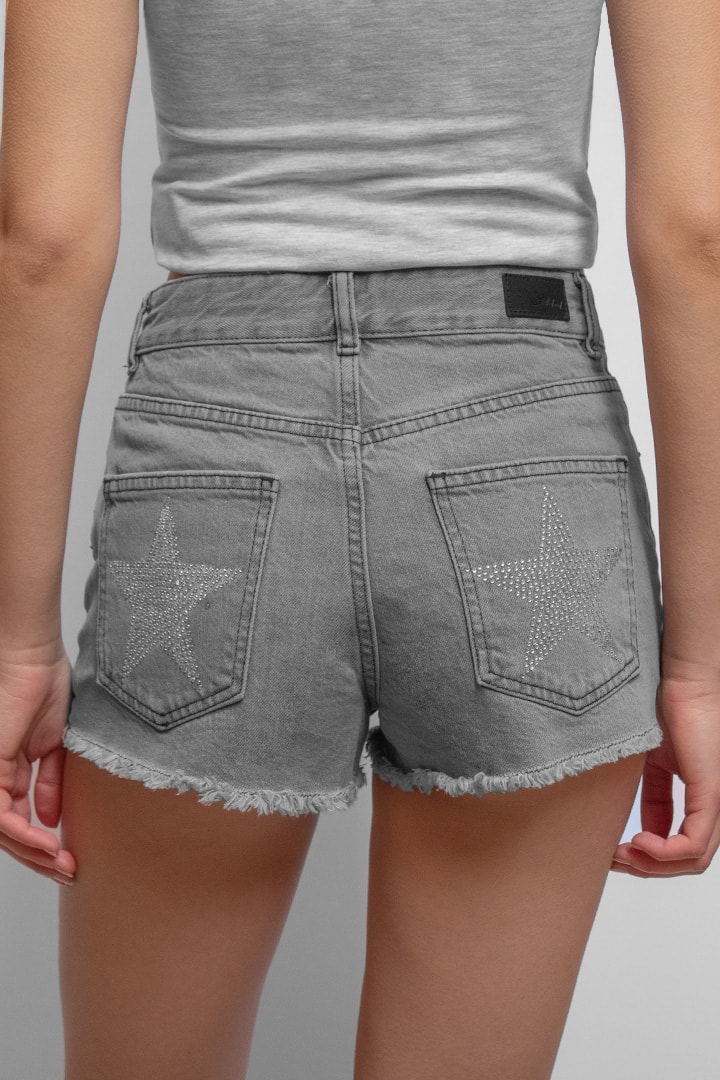 Shorts with stars rhinestone on the back, low waist, 4 pockets, belt loops, raw edge hem, button up and zip fastening, regular length, slim fit.