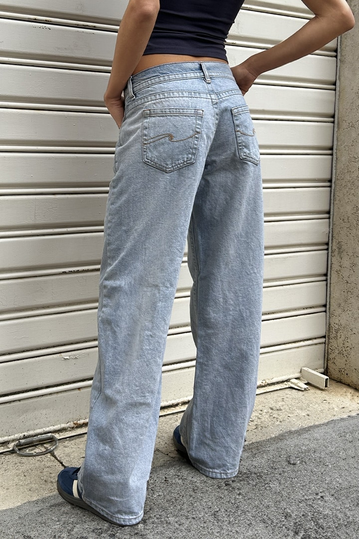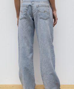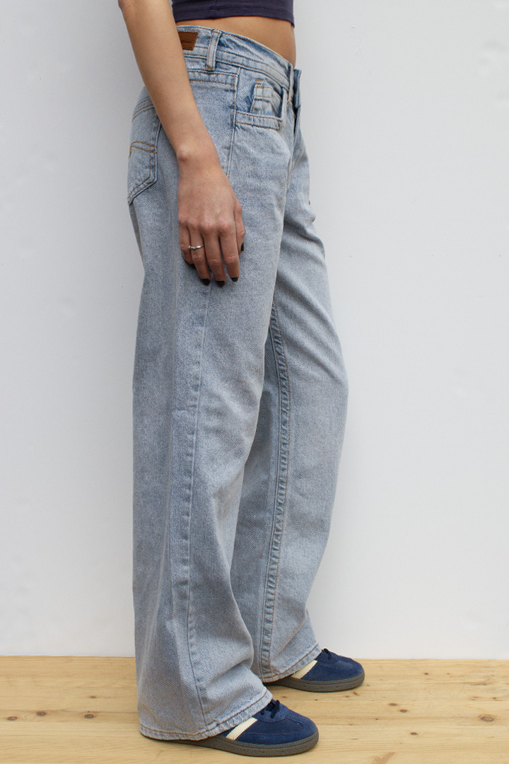 Wide leg jeans, low waist, button up and zip fastening, back pockets with embroidery, 4 pockets, belt loops, relaxed fit.