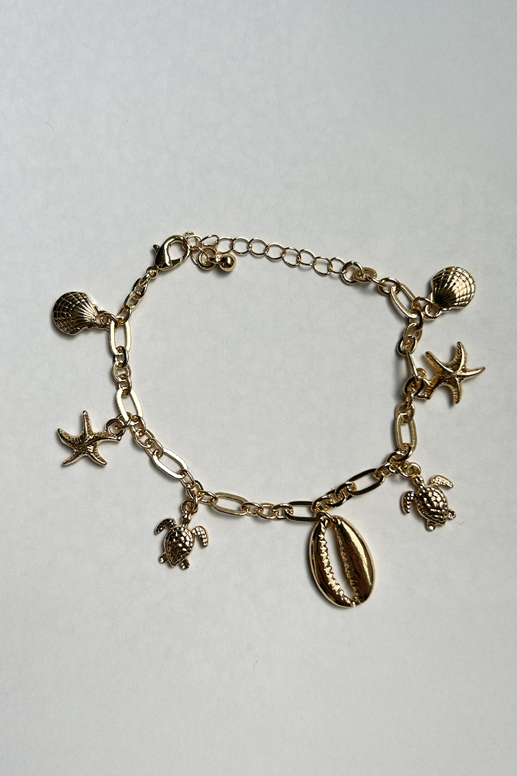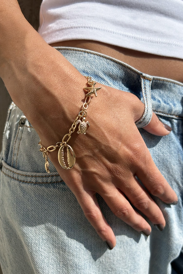 Multi pendant bracelet, adjustable length, snap-hook fastening.