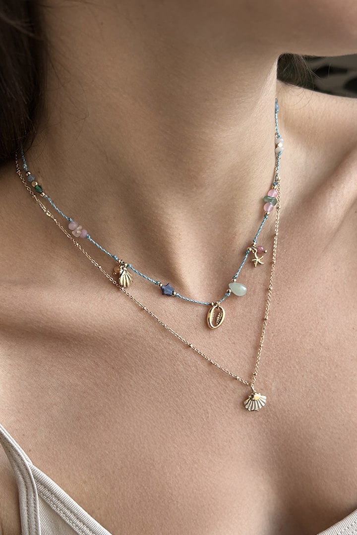 Necklace with pendants and stones, snap-hook fastening, adjustable length.