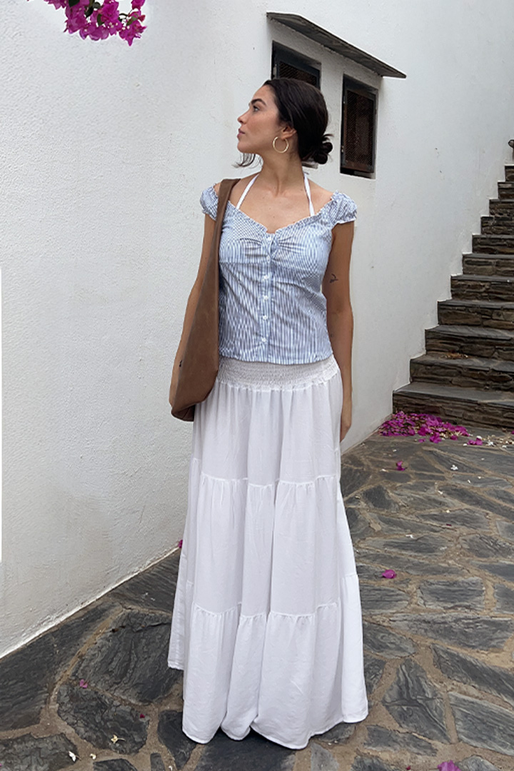 Ruffle long skirt, elastic waistband, long length, relaxed fit.
