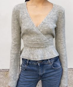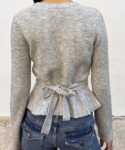V neck sweater, with ruffle hem, backlace-up detail, long sleeves, regular length, slim fit.