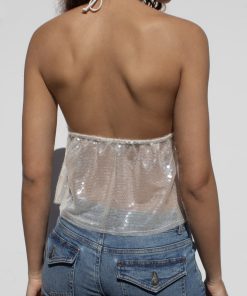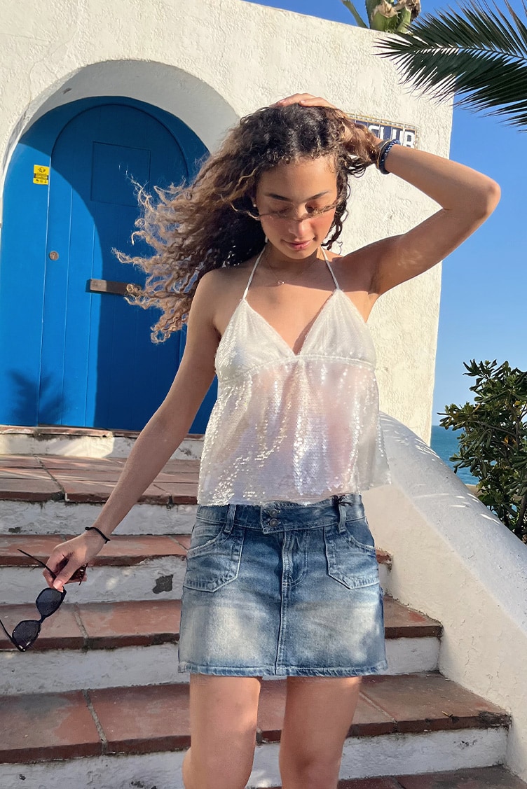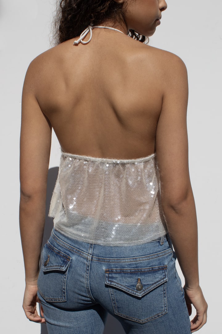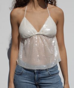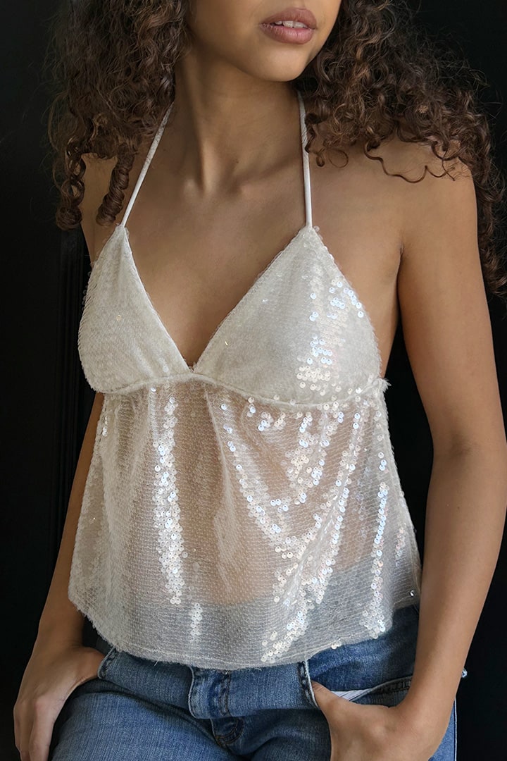 Sequined top, V neckline, back tie fastening, regular length, relaxed fit.