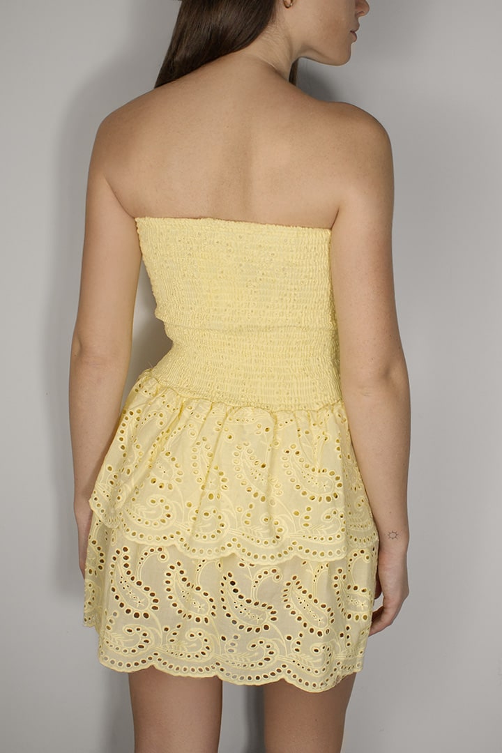 Shirred dress, sleeveless, with double ruffle, short sleeves, tight fit.