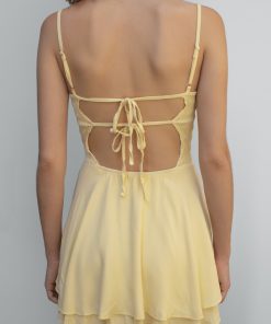 Shirred dress, square neckline, skirt with ruffle, lace-up detail on the back, with adjustable shoulder straps, short length, tight fit.