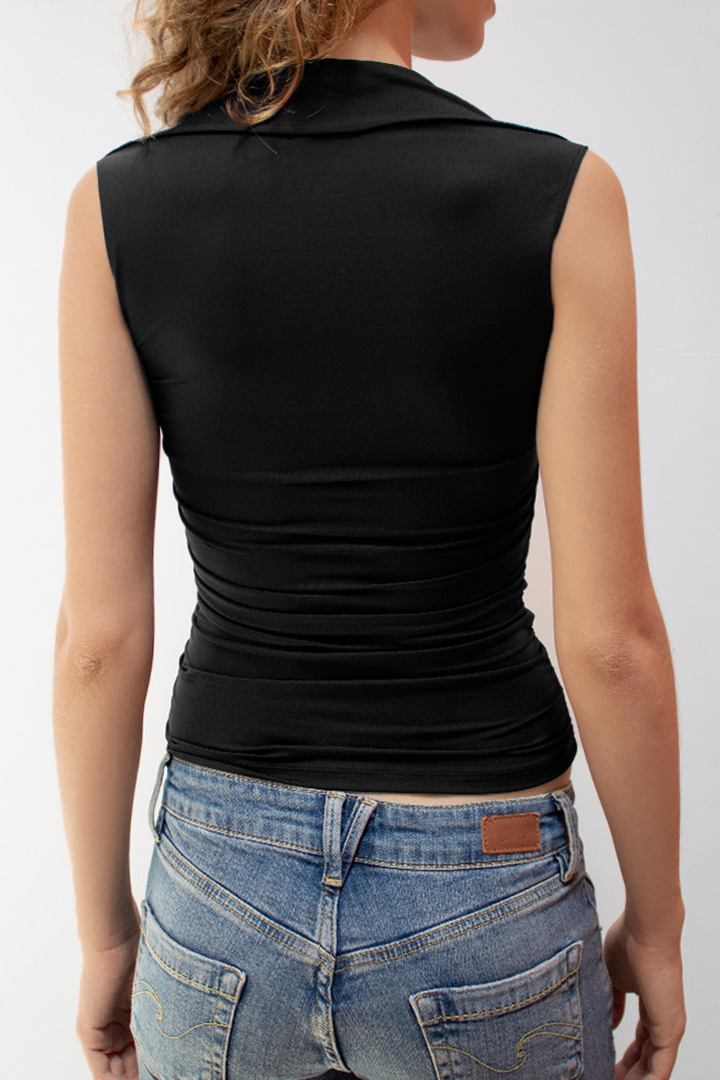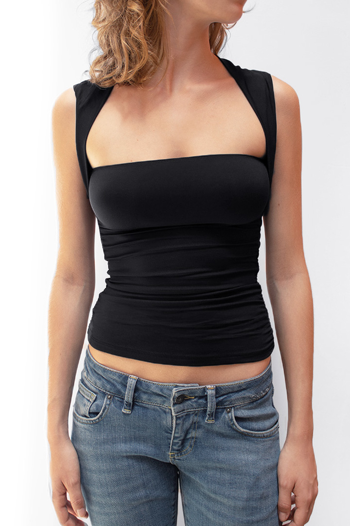 T-shirt with square neckline, sleeveless, side frills, lycra tactel fabric, regular length, tight fit.