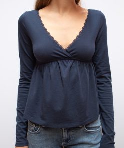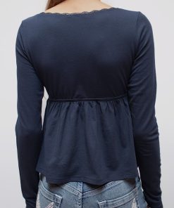 T-shirt with ruffle, v neckline, lace detail on the neckline, long sleeves, regular length, relaxed fit.