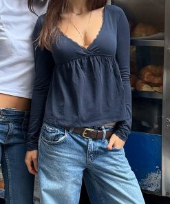 T-shirt with ruffle, v neckline, lace detail on the neckline, long sleeves, regular length, relaxed fit.
